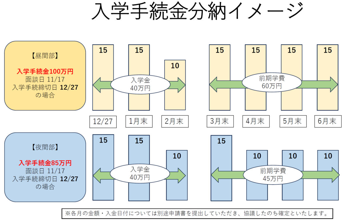 もし、学費や入学金のご準備が難しい学生さんの場合は、ご相談に応じ分納の手続きをすることが出来ます。以下の入学手続金の分納のイメージを参照ください。【別途申請書必要】