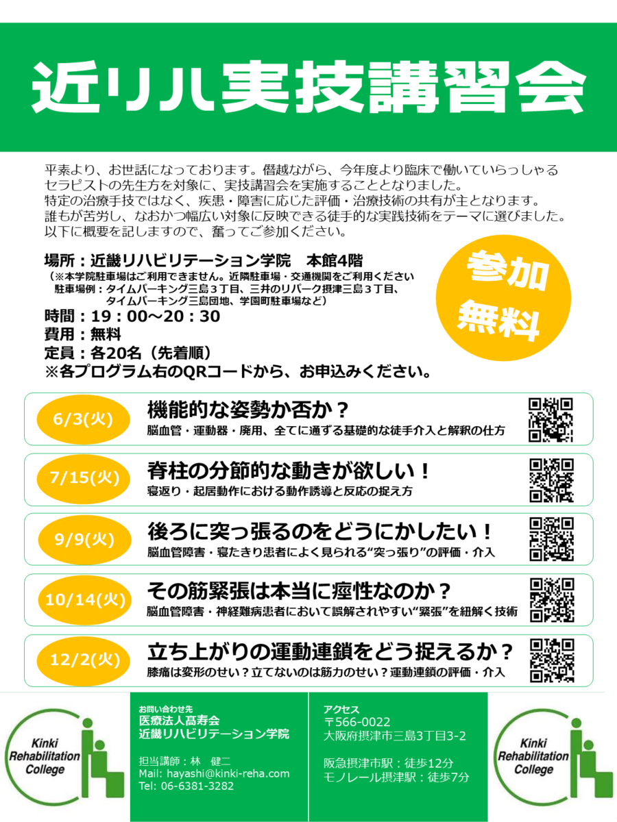 僭越ながら、今年度より臨床現場で働いていらっしゃるセラピストの先生方を対象に、無料の実技講習会を実施することとなりました。特定の治療手技ではなく、疾患・障害に応じた評価・治療技術の共有が主となります。