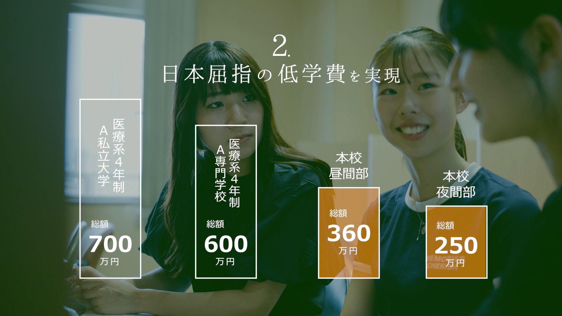 本学院の3年間にかかる学費合計は昼間部で360万円、夜間部で250万円です。