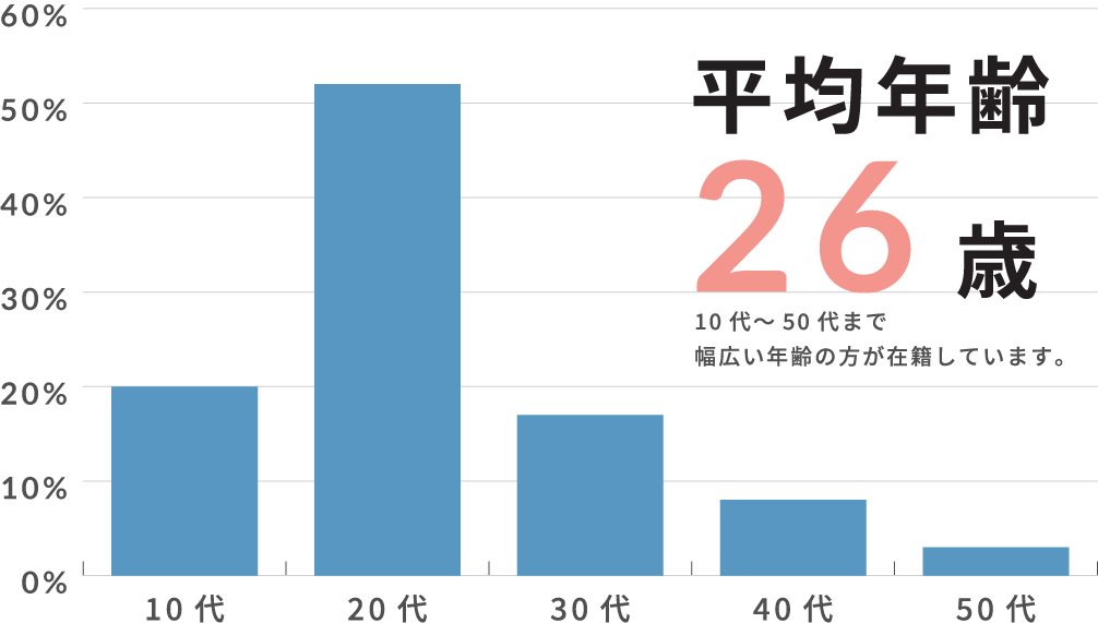 10代~50代までの様々な世代の方がいるので、多くの刺激を受けることができます。勉強に集中できる落ち着いた環境で学べます。